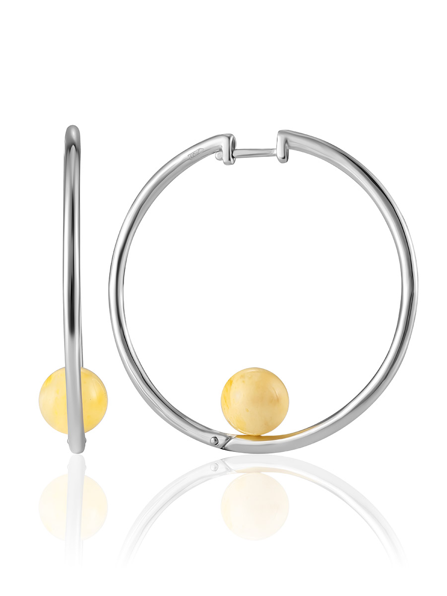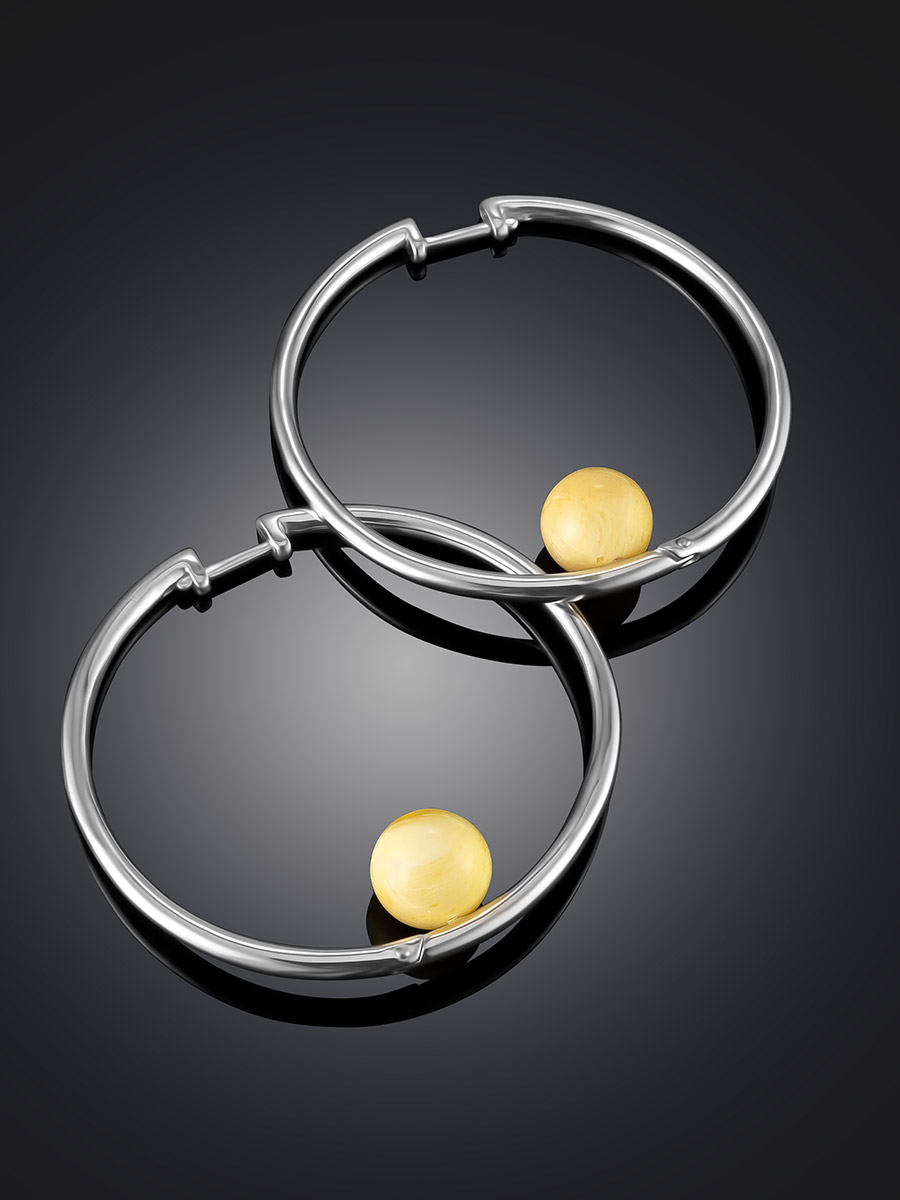 Accent hoop earrings in silver with natural amber beads. Jewelry for the one who values the unusual and chooses an original design.